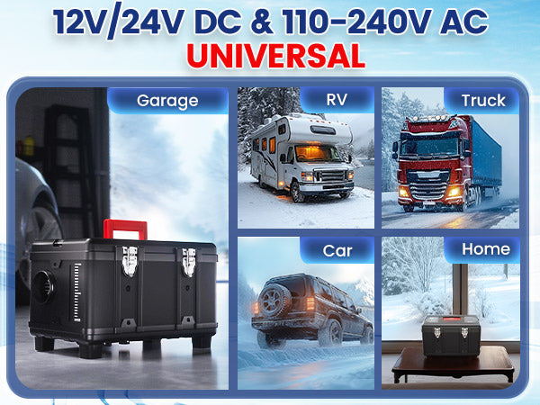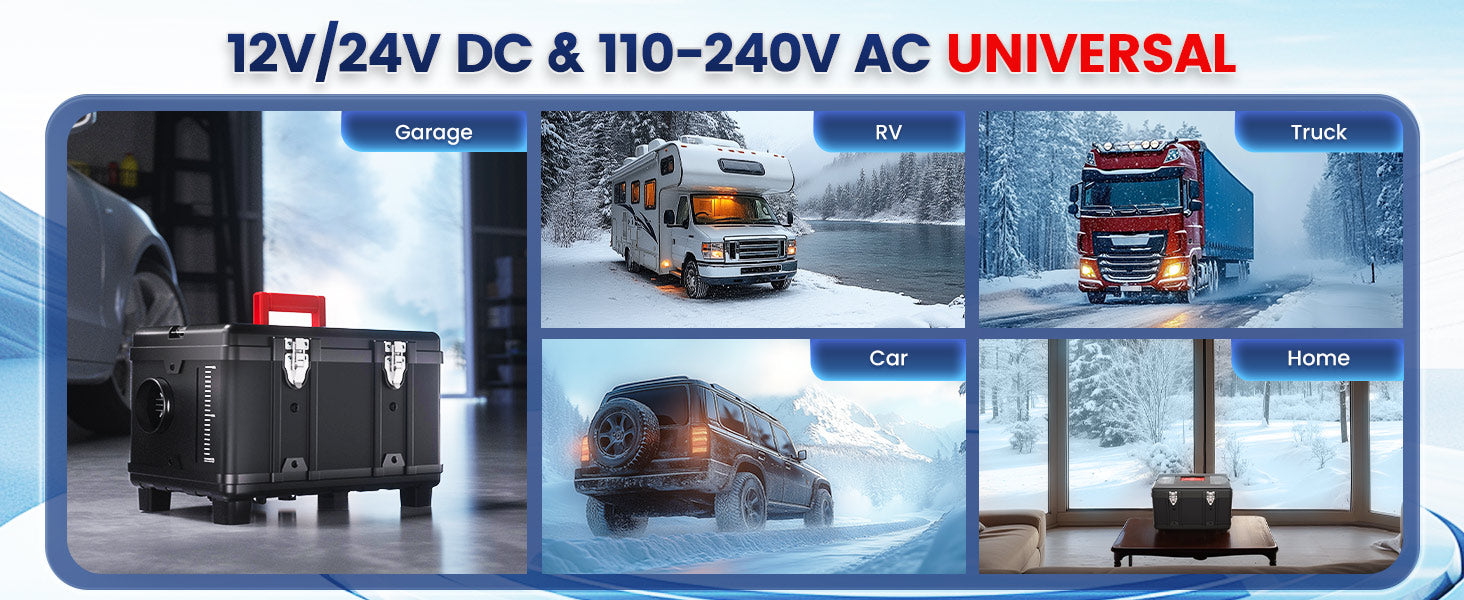 Support 12V/24V DC & 110V-240V AC, automatically switches between vehicle and household power, allowing you to use it both on the road and at home.