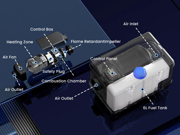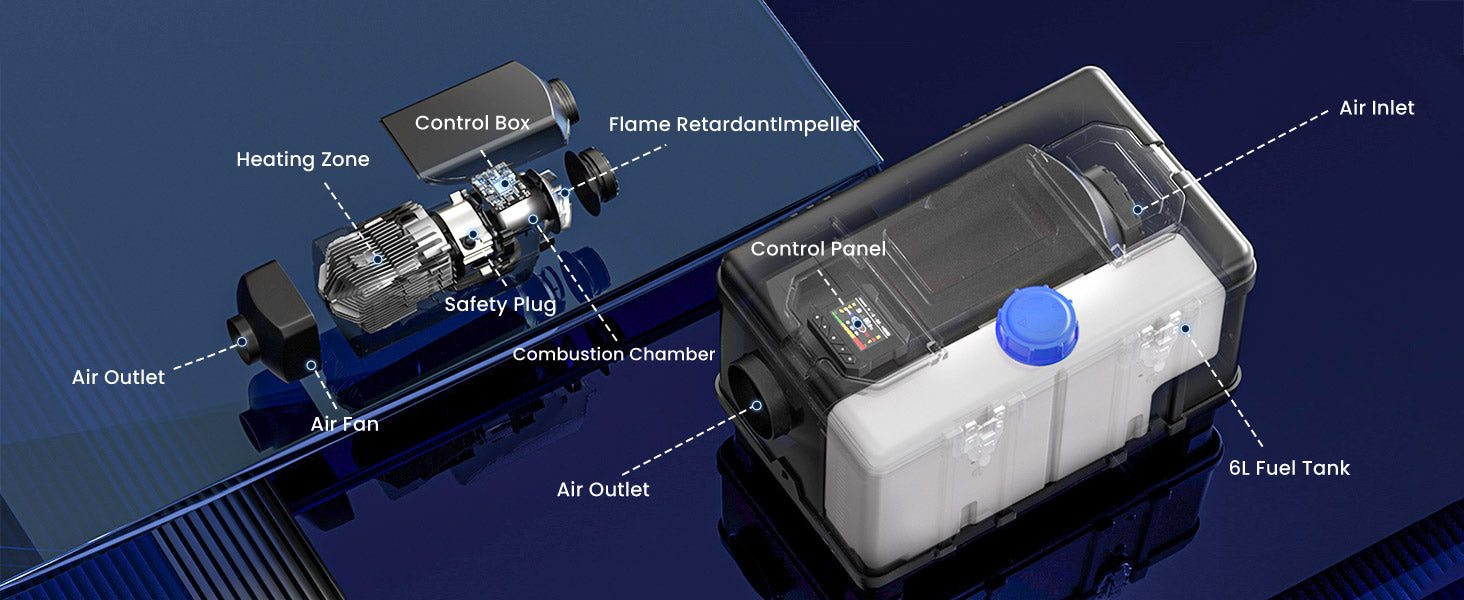 Equipped with a 6L fuel tank, compact and portable design, smart bluetooth control with altitude mode. Offers fuel consumption rates as low as 0.15-0.44L/h, supports 12V/24V DC & 110V-240V AC, and fits for RV, Trucks, and outdoor adventures.