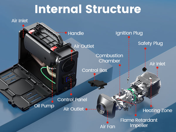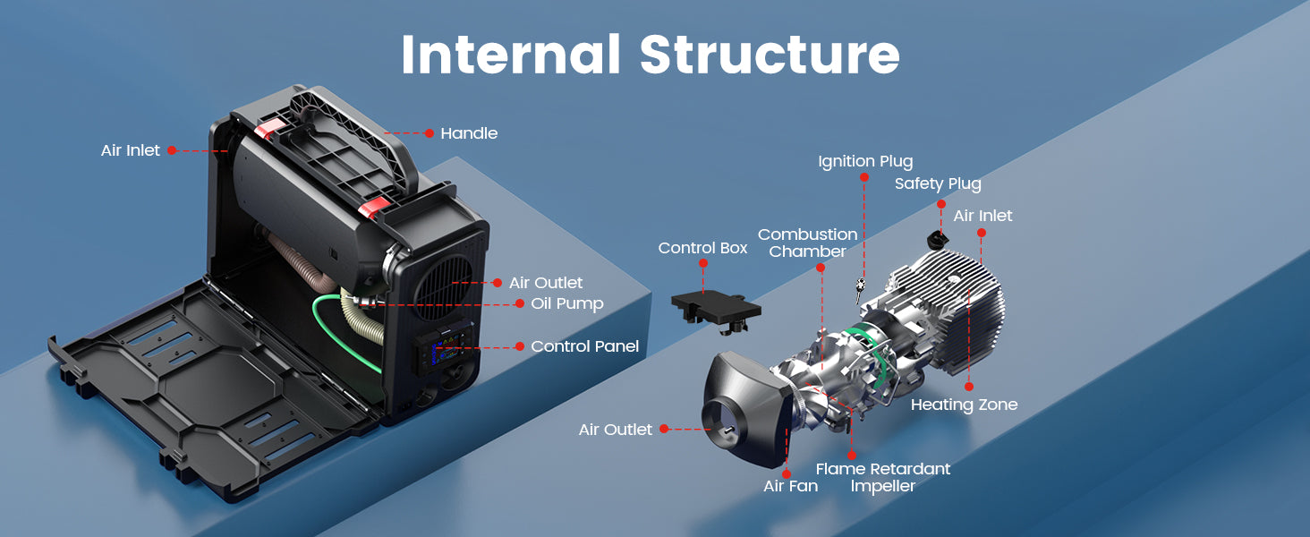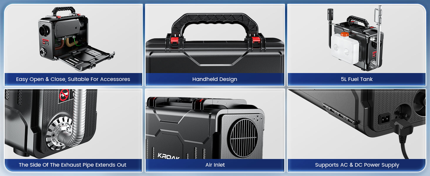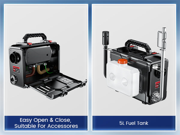 The compact, toolbox-style design makes it more convenient for customers to use. The built-in handle makes it easy to carry. The buckle design allows you to maintain the diesel heater anytime without complex tools.
